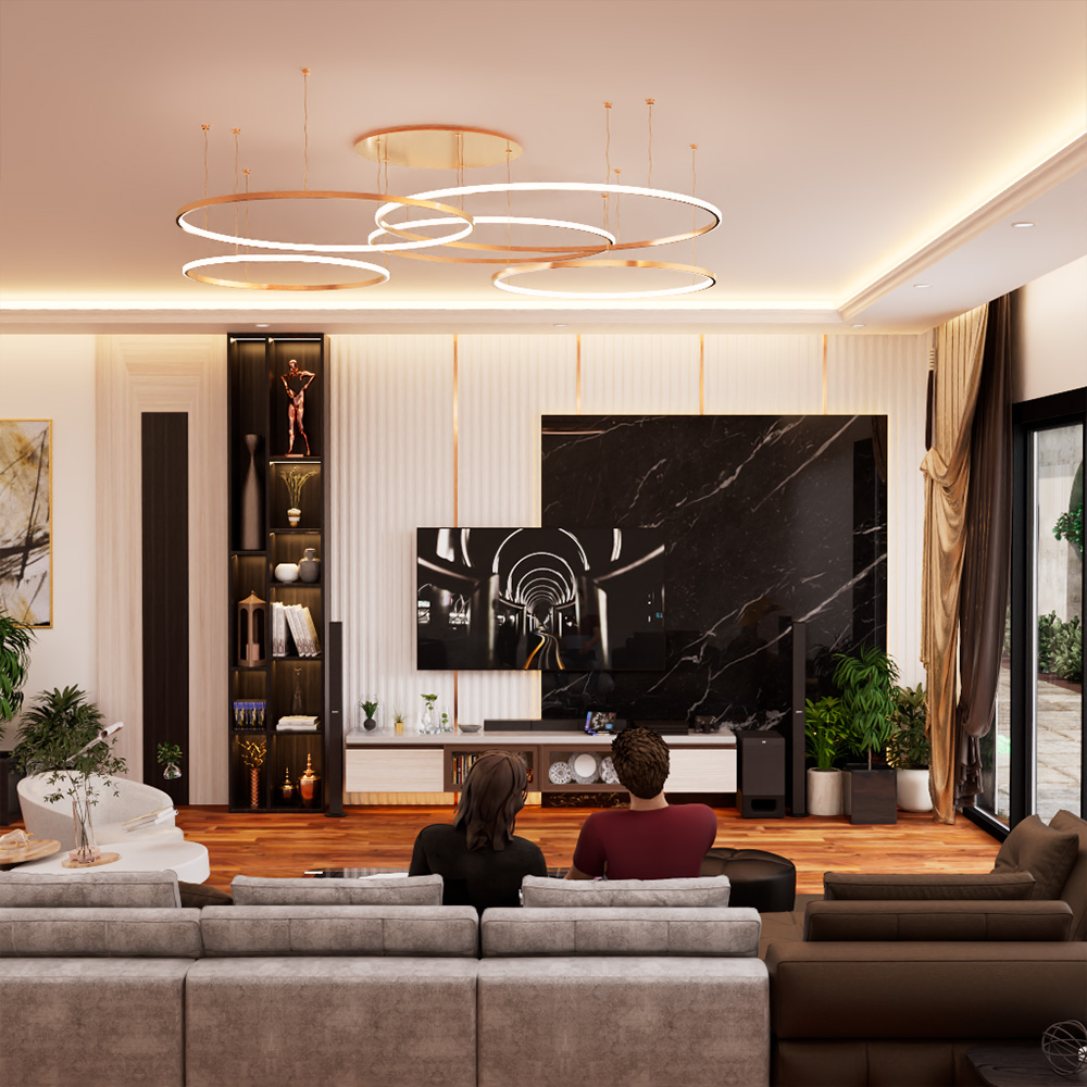Every surface, from marble floors to wooden accents and fabric elements, was carefully textured to reflect the richness and realism of The Karighars’ design palette.